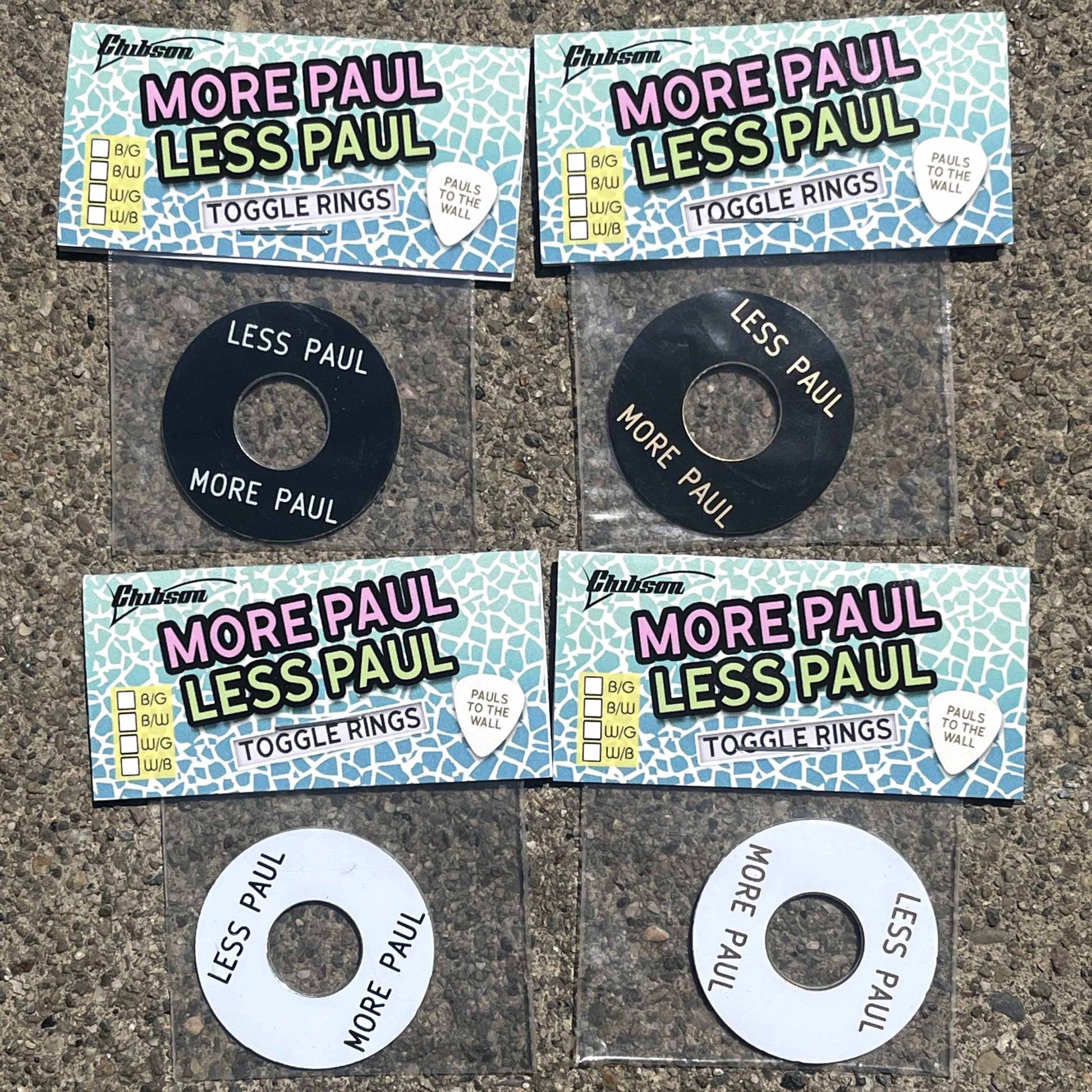 The Chibson USA More Paul / Less Paul toggle rings are made from heavy-duty black fiberglass and machine-printed letters. Measures 1-1/4" Diameter.